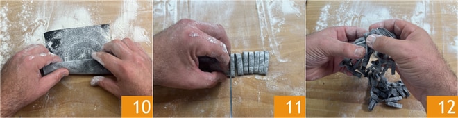 Rollen Sie die Blätter von der kurzen Seite her auf 10 und schneiden Sie die Rollen in etwa 7 mm breite Streifen 11. Entrollen Sie die Tagliatelle mit Sepia-Tinte 12.