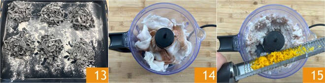 Legen Sie sie auf ein mit Grieß bestäubtes Blech 13 und stellen Sie sie bis zur Verwendung in den Kühlschrank. Gehen Sie zur Lardopaste über: Geben Sie die Lardo-Scheiben in einen Mixer 14 und pürieren Sie sie 30 Sekunden lang bei maximaler Geschwindigkeit. Fügen Sie dann die geriebene Orangenschale hinzu 15.