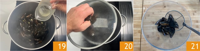 Löschen Sie mit Weißwein ab 19 und lassen Sie den gesamten Alkohol verdampfen. Decken Sie den Topf mit einem Deckel ab 20 und kochen Sie etwa 3 Minuten lang, wobei Sie die Pfanne gelegentlich schütteln. Wenn die Miesmuscheln sich geöffnet haben, lassen Sie sie abtropfen 21.
