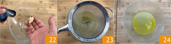 Entfernen Sie die Schalen der Muscheln 22 und sammeln Sie sie in einer Schüssel. Filtern Sie den Kochfond der Miesmuscheln 23 und stellen Sie ihn beiseite 24.