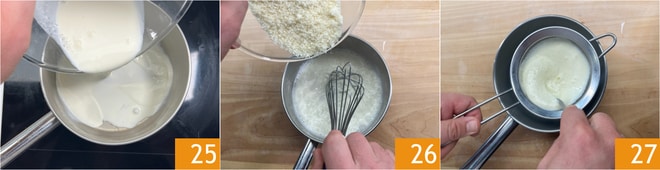 Zum Schluss bereiten Sie die Pecorino-Creme zu: Gießen Sie die Sahne in einen kleinen Topf 25 und bringen Sie sie fast zum Kochen, nehmen Sie dann den Topf vom Herd und fügen Sie den geriebenen Pecorino Romano hinzu 26. Rühren Sie kräftig mit einem Schneebesen, bis er sich vollständig aufgelöst hat. Geben Sie die Creme durch ein Sieb, um sie glatter und homogener zu machen 27.