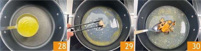 Geben Sie nun eine Kelle des Kochfonds der Miesmuscheln in eine große Pfanne 28, dann fügen Sie einen Esslöffel Lardopaste hinzu 29. Lassen Sie den Lardo bei schwacher Hitze schmelzen, dann fügen Sie die Miesmuscheln hinzu 30 und kochen Sie sie ein paar Minuten.