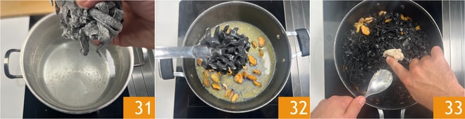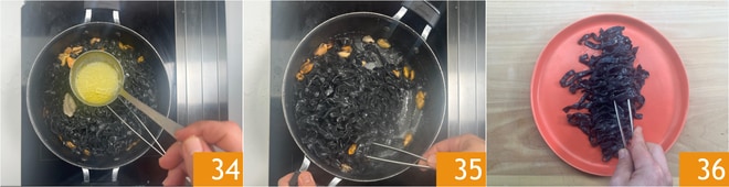 Falls nötig, können Sie die Cremigkeit mit noch etwas Kochwasser der Miesmuscheln anpassen 34, dann gut mischen 35. Die Tagliatelle mit Sepia-Tinte anrichten 36.