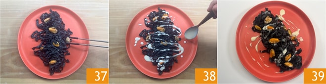 Fügen Sie die geschälten Miesmuscheln hinzu 37 und vervollständigen Sie mit der Pecorino-Creme 38. Die Tagliatelle mit Sepia-Tinte, Pecorino, Miesmuscheln und Lardo sind bereit serviert zu werden 39!