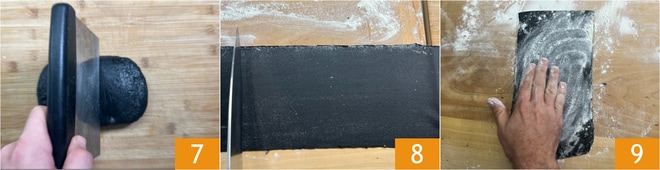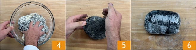 Integrieren Sie die Sepia-Tinten-Mischung, indem Sie zuerst mit einer Gabel und dann mit den Händen arbeiten 4, bis Sie einen glatten und homogenen Teig erhalten 5. Wickeln Sie ihn in Frischhaltefolie 6 und lassen Sie ihn 30 Minuten bei Raumtemperatur ruhen.