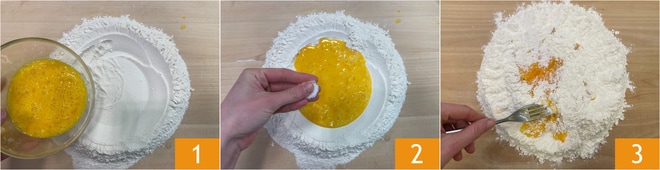 Um die Tagliatelle mit Hofragout zuzubereiten, beginnen Sie mit dem Teig: Formen Sie das Mehl zu einem Brunnen und geben Sie die leicht geschlagenen Eier in die Mitte 1. Fügen Sie eine Prise Salz hinzu 2 und beginnen Sie, das Mehl mit einer Gabel zu vermischen 3.