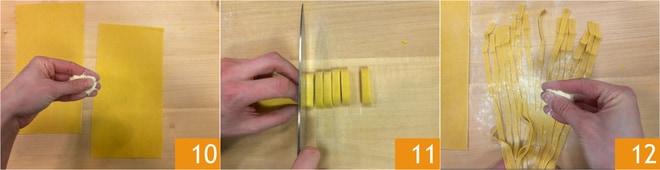 Bestreuen Sie die Rechtecke mit weiterem Grieß 10, rollen Sie sie dann auf und schneiden Sie sie in etwa 7-8 mm breite Streifen 11. Entrollen Sie die Tagliatelle und bestreuen Sie sie mit weiterem Grieß 12.