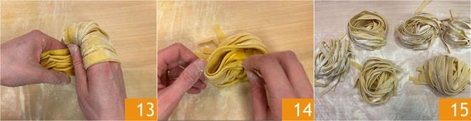 Wickeln Sie die Tagliatelle um die Hand 13, um Nester zu bilden 14, und lassen Sie sie auf der Arbeitsfläche ruhen, bis sie gebraucht werden 15.
