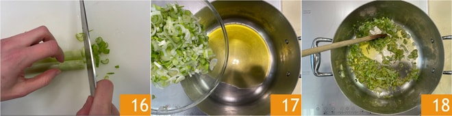 Machen Sie sich nun an die Zubereitung des Ragouts: Schneiden Sie die Frühlingszwiebeln fein, einschließlich des grünen Teils 16. Erhitzen Sie in einem Topf etwas Öl, fügen Sie die Frühlingszwiebeln hinzu 17 und dünsten Sie sie 8 Minuten bei mittlerer Hitze. Wenn sie gar sind 18, nehmen Sie sie aus dem Topf und stellen Sie sie beiseite.