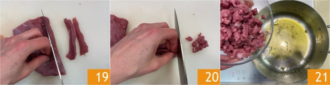 Schneiden Sie die Truthahn- und Entenbrust zuerst in Streifen 19 und dann in kleine Würfel 20. Erhitzen Sie in demselben Topf, in dem Sie die Frühlingszwiebeln gekocht haben, nochmals etwas Öl und fügen Sie das Fleisch hinzu 21. Braten Sie es bei starker Hitze unter häufigem Rühren etwa 10 Minuten an.