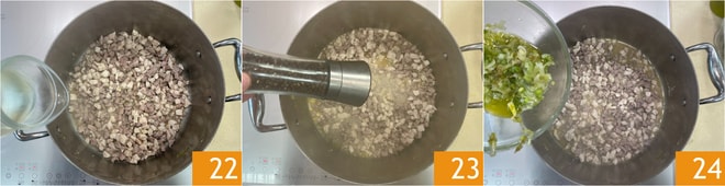 Löschen Sie mit Weißwein ab 22 und kratzen Sie den Bodensatz mit einem Holzlöffel ab, dann würzen Sie mit Salz und Pfeffer 23. Wenn der gesamte Alkohol verdampft ist, fügen Sie die Frühlingszwiebeln hinzu 24.