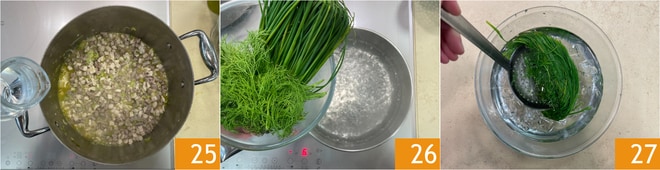Geben Sie schließlich das Wasser hinzu 25 und kochen Sie bei mittlerer Hitze 20 Minuten lang. Inzwischen machen Sie sich an die Zubereitung der Kräutersauce: Blanchieren Sie den Schnittlauch und den Fenchel eine Minute lang 26, dann abgießen und in Eiswasser abkühlen 27.