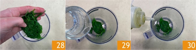 Die Kräuter abgießen und gut ausdrücken, dann in ein Gefäß geben 28 zusammen mit dem Wasser 29 und dem Öl 30.
