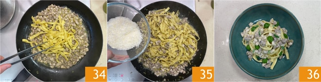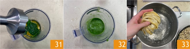 Mixen Sie mit einem Stabmixer 31 bis Sie eine glatte und homogene Sauce erhalten 32. Kochen Sie die Tagliatelle in reichlich gesalzenem, kochendem Wasser für 2-3 Minuten 33.