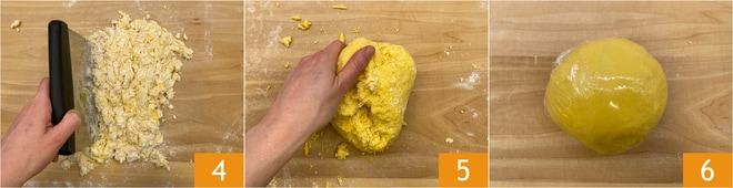 Kneten Sie zuerst mit einem Teigschaber 4 und dann mit den Händen 5, bis Sie einen glatten und homogenen Teig erhalten. Wickeln Sie ihn in Frischhaltefolie ein 6 und lassen Sie ihn für mindestens 20 Minuten im Kühlschrank ruhen.