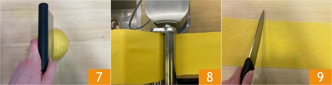Holen Sie den Teig heraus und schneiden Sie ihn in zwei Hälften 7, rollen Sie ihn dann mit einem Nudelholz von der dicksten Einstellung aus 8, geben Sie bei den ersten Durchgängen Verstärkungsfalten, bis Sie Teigplatten von etwa 2 mm Dicke erhalten. Streuen Sie Hartweizengrieß auf die Arbeitsfläche und schneiden Sie die Platten in Rechtecke von 30 cm Länge 9.