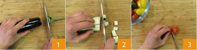 Um die Tagliatelle mit Auberginen, Pesto und Kirschtomaten zuzubereiten, bereiten Sie zuerst das Pesto ohne Knoblauch nach den Anweisungen in unserem Rezept zu. Waschen und trocknen Sie die Auberginen, entfernen Sie die Enden 1 und schneiden Sie sie zuerst in Scheiben und dann in Würfel 2. Kümmern Sie sich um die Kirschtomaten: Waschen und trocknen Sie sie und halbieren Sie sie 3.