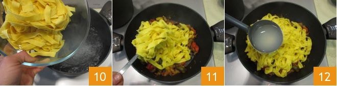 Kochen Sie die Tagliatelle al dente 10. Lassen Sie die Pasta direkt in die Sauce abtropfen 11, geben Sie einen Schöpflöffel Kochwasser hinzu 12.