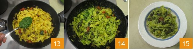 Fügen Sie an dieser Stelle auch das Pesto hinzu 13 und schwenken Sie die Pasta, um sie zu vermischen und zu würzen 14, es dauert nur wenige Minuten. Servieren Sie die Tagliatelle mit Auberginen, Pesto und Kirschtomaten heiß 15.