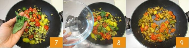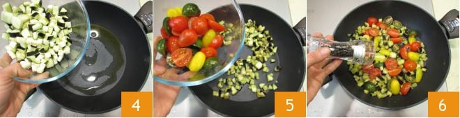 Erhitzen Sie in einem Topf etwas Olivenöl 4, geben Sie die Auberginen hinzu und braten Sie sie bei mittlerer Hitze 5 Minuten an. Fügen Sie auch die Kirschtomaten hinzu 5, salzen und pfeffern Sie 6 und mischen Sie alles.