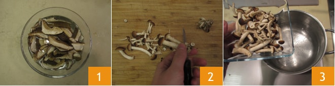 Um die Tagliatelle mit Pilzragout und Trockenfrüchten zuzubereiten, beginnen Sie damit, die Steinpilze einzuweichen. Geben Sie sie in eine Schüssel mit frischem Wasser 1. In der Zwischenzeit putzen Sie die Pioppini: Entfernen Sie den erdigen Teil 2 und spülen Sie sie dann ab. Anschließend blanchieren Sie sie etwa 15 Minuten lang 3.