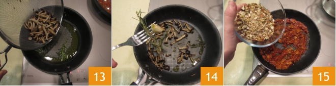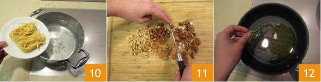 In der Zwischenzeit einen Topf mit Wasser erhitzen, um die Pasta zu kochen 11 und bereiten Sie den Rest vor: die Trockenfrüchte hacken 11. In einer Pfanne etwas Öl erhitzen und mit Knoblauch und Rosmarin aromatisieren 12,