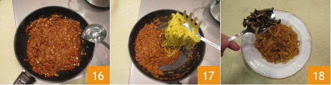 und bei Bedarf mit einem Schuss Kochwasser der Pasta verlängern 16. Dann die Tagliatelle abtropfen lassen und vermischen 17. Anrichten, indem Sie die Pasta auf die Teller geben und mit den Pioppini garnieren 18.