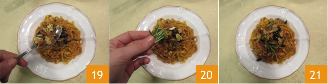 Fügen Sie die Trockenfrüchtemischung hinzu 19, ein paar Rosmarinnadeln 20 und Ihre Tagliatelle mit Pilzragout und Trockenfrüchten sind servierbereit, guten Appetit 21.