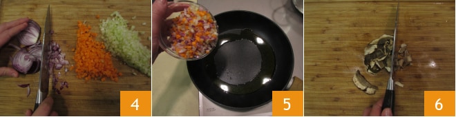In der Zwischenzeit Zwiebel, Sellerie und Karotte fein hacken 4. In einer Pfanne etwas Öl erhitzen und dann das gehackte Gemüse hinzugeben. Lassen Sie es bei mittlerer Hitze etwa zehn Minuten dünsten 5. In der Zwischenzeit die Steinpilze abtropfen lassen und grob hacken 6.