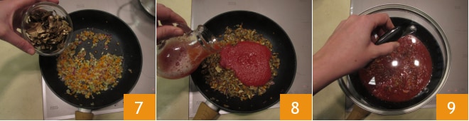 An diesem Punkt sollte das Gemüse weich geworden sein, fügen Sie die Steinpilze hinzu und würzen Sie mit Salz 7, dann die Tomatensauce dazugeben 8, den Krug ausspülen und so einen Schuss Wasser zur Sauce hinzufügen, und abdecken und 15 Minuten mit Deckel kochen lassen 9.