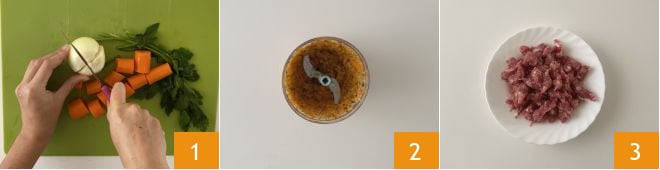 Um die Tagliatellennester mit Wurstragout zuzubereiten, schälen Sie zuerst die Karotten und die Zwiebel. Schneiden Sie sie in grobe Stücke 1 und pürieren Sie sie in einem Mixer zusammen mit dem Selleriezweig 2. Bröseln Sie die Wurst in einen Teller und legen Sie sie beiseite 3.