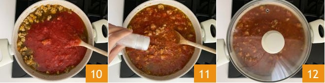fügen Sie auch das Tomatenpüree hinzu 10. Würzen Sie mit Salz 11 und Pfeffer, dann decken Sie mit einem Deckel ab 12 und lassen Sie es 40 Minuten kochen.