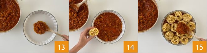 Nehmen Sie nun eine Auflaufform, die groß genug ist, damit sich die Nester nicht überlappen, und bedecken Sie den Boden mit dem Ragout 13. Platzieren Sie darauf die Tagliatellennester 14 und bedecken Sie mit der restlichen Sauce 15, achten Sie darauf, die Nudeln gut zu bedecken, da sie dadurch gekocht werden.
