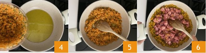 Gießen Sie das Öl in einen Topf, fügen Sie das Sofritto hinzu 4 und lassen Sie es für ein paar Minuten anbraten 5. Fügen Sie die Wurst hinzu und lassen Sie sie anbraten 6