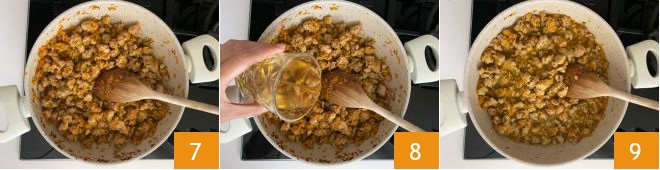 bis sie schön goldbraun ist 7. Löschen Sie nun mit dem Weißwein ab 8 und sobald der Alkohol vollständig verdampft ist 9