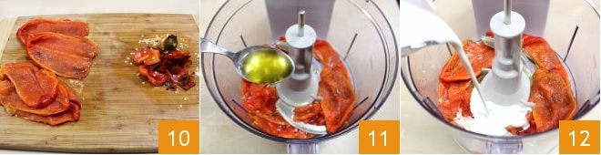 Entfernen Sie den Stiel, öffnen Sie sie und entfernen Sie alle Samen und inneren Fasern 10, dann geben Sie die erhaltenen Paprikastreifen zusammen mit dem Öl 11, dem Salz und der Sahne 12 in einen Mixer. Schalten Sie die Messer des Mixers ein und pürieren Sie ein paar Minuten,