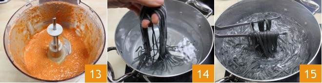 um eine glatte und samtige Paprikasoße 13 zu erhalten. Bringen Sie einen Topf mit gesalzenem Wasser zum Kochen und tauchen Sie die Tagliolini ein, die Sie bissfest kochen lassen (14-15).