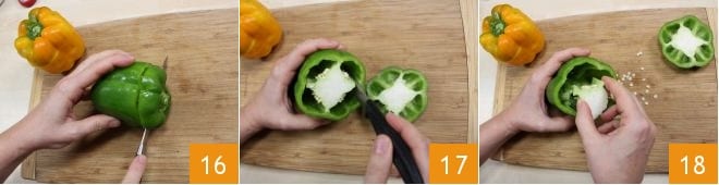 Während die Pasta kocht, machen Sie sich an das Schnitzen der Paprikas für die finale Dekoration des Gerichts: Schneiden Sie den oberen Teil der 4 Paprikas ab, etwa auf ¾ der Höhe, und erhalten Sie eine Art Hut 16. Entfernen Sie mit einem scharfen Messer mit Spitze die weißen inneren Fasern und die Samen (17-18).