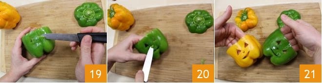 Schnitzen Sie nun die Paprikas an der glatteren Seite ohne Dellen: schneiden Sie zwei gleichmäßige Dreiecke für die Augen 19; einen langen unteren Schnitt, der der Mund sein wird, und schließlich ein kleineres mittleres Dreieck, das als Nase dient 20, genau wie auf dem Foto 21.