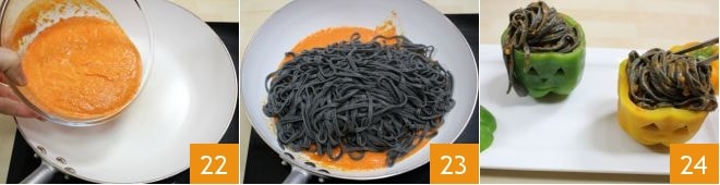 Geben Sie die rote Paprikasoße in eine Antihaftpfanne 22 und wenn die Pasta gekocht ist, gießen Sie sie ab und fügen Sie sie zur Soße hinzu: lassen Sie alles eine Minute bei starker Hitze anbraten 23, um die Zutaten gut miteinander zu verbinden. Legen Sie auf einem Servierteller die geschnitzten Paprikas und füllen Sie mit einer Pinzette jede Paprika mit einer Handvoll verhexten Tagliolini 24 und legen Sie den zuvor abgeschnittenen oberen Teil der Paprika als Hut darauf. Wenn Sie noch Pasta übrig haben, legen Sie sie rund um den Teller und Ihre verhexten Tagliolini in Paprika sind servierfertig! Frohes Halloween!