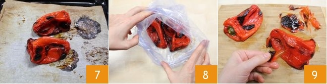 Heizen Sie den Ofen auf 250°C vor; waschen und trocknen Sie die roten Paprikas, legen Sie dann ein Backblech mit Backpapier aus, legen Sie die Paprikas darauf und backen Sie sie 30 Minuten lang, bis die Haut geröstet ist 7 und sich zu lösen beginnt (siehe Anleitung, indem Sie hier klicken). Wenn die Paprikas fertig sind, nehmen Sie sie aus dem Ofen und schließen Sie sie in einen Plastikbeutel 8: lassen Sie sie schwitzen, bis sie lauwarm werden, dann nehmen Sie sie heraus und schälen Sie sie (siehe, wie man das macht, indem Sie hier klicken). So lässt sich die Haut leichter entfernen 9.
