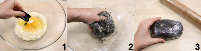 Um die verhexten Tagliolini in Paprika zuzubereiten, beginnen Sie mit den Eiertagliolini mit Sepiatinte. Geben Sie in eine große Schüssel das Mehl, die Eier, das Salz und die Sepiatinte 1 und kneten Sie mit den Händen, bis alle Zutaten vermischt sind 2. Übertragen Sie den Teig auf eine bemehlte Arbeitsfläche und kneten Sie ihn gut, bis er glatt und homogen ist. Wickeln Sie ihn in Frischhaltefolie 3 und lassen Sie ihn etwa eine halbe Stunde ruhen.