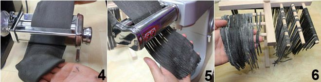 Nach dieser Zeit verarbeiten Sie den Teig mit einer Pastamaschine, um eine etwa 1 mm dicke Teigplatte zu erhalten 4. Montieren Sie die Stange, um 2-3 mm breite Streifen zu erhalten und führen Sie die Teigplatten durch 5: sammeln Sie die erhaltenen Tagliolini mit der Hand und legen Sie sie auf eine bemehlte Arbeitsfläche oder hängen Sie sie auf einen Trockner oder Pastaständer, gut bemehlt, und lassen Sie sie einige Minuten trocknen 6.