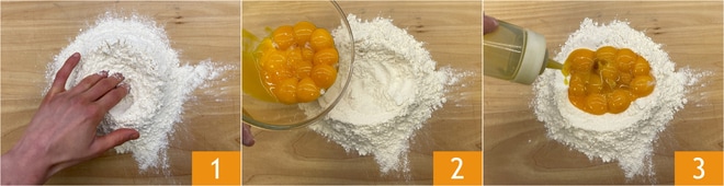 Um die Tajarin 30 Eigelb mit Wurstragout zuzubereiten, bereiten Sie zunächst die frische Pasta vor: Das Mehl zu einem Brunnen auf das Nudelbrett geben 1 und die Eigelbe in die Mitte geben 2, dann einen Schuss Öl hinzufügen 3.