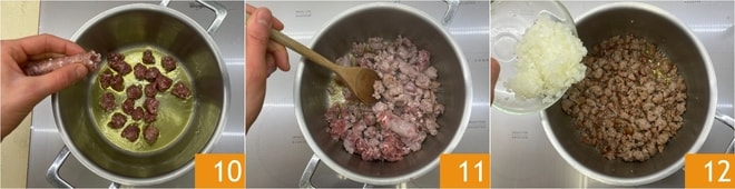 Schneiden und hacken Sie die Zwiebel, die Karotte und den Sellerie fein. Erhitzen Sie etwas Öl in einem Topf, dann zerbröseln Sie die Wurst darin, nachdem Sie vorher die Pelle entfernt haben 10. Braten Sie das Fleisch bei starker Hitze an und zerbrechen Sie es mit einem Holzlöffel, achten Sie jedoch darauf, es nicht zu sehr austrocknen zu lassen und den Bratensatz nicht zu verbrennen 11. Wenn die Wurst goldbraun ist, fügen Sie die gehackte Zwiebel hinzu 12.