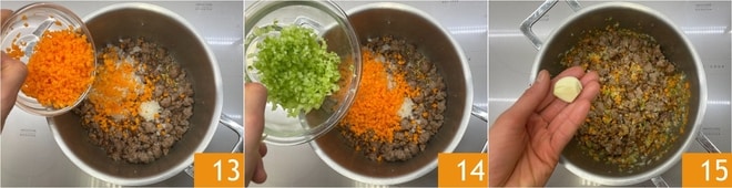 Fügen Sie auch die Karotte 13, den Sellerie 14 und eine ganze Knoblauchzehe hinzu 15, dann lassen Sie alles bei schwacher Hitze anbraten.