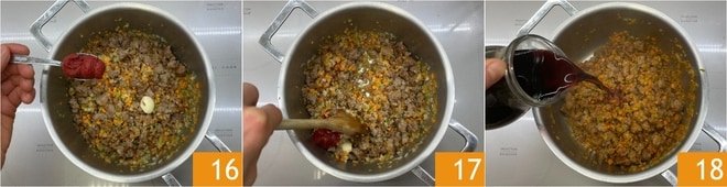 Nach einigen Minuten den Tomatenmark hinzufügen 16 und gut umrühren, um ihn zu rösten, und dabei ständig den Bratensatz abschaben 17. An dieser Stelle den Knoblauch entfernen und mit dem Rotwein ablöschen 18, dabei weiterhin den Boden mit dem Löffel abschaben, um ihn zu deglasieren.