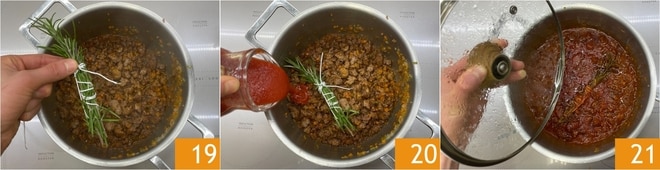 Fügen Sie das Kräuterbündel hinzu, das Sie mit einer Schnur zusammengebunden haben 19, dann geben Sie die passierten Tomaten 20 und einen Spritzer Wasser hinzu, gerade genug, um die Flasche auszuspülen. Decken Sie mit einem Deckel ab und kochen Sie alles mindestens 30 Minuten 21.