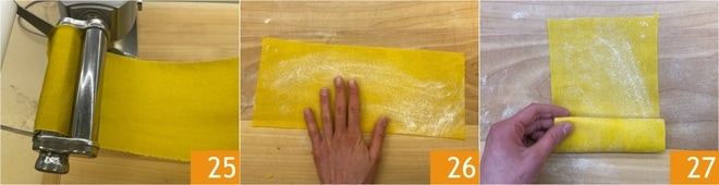 Nach der Ruhezeit nehmen Sie den Teig und verarbeiten jeweils eine Portion, wobei Sie darauf achten, den Rest in Folie zu wickeln, damit er nicht austrocknet. Bestäuben Sie die Teigportion leicht mit Grieß 22, drücken Sie sie mit der Handfläche flach und beginnen Sie, sie in der Nudelmaschine vom dicksten zur dünnsten Einstellung auszurollen 23. Machen Sie zwischendurch einige Falten 24.