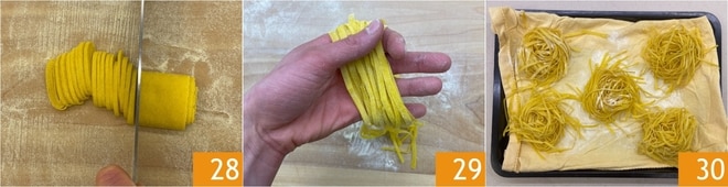 Schneiden Sie die Rolle, um Tajarin mit einer Breite von maximal 3 mm zu erhalten 28, dann rollen Sie sie aus 29 und bestreuen Sie sie erneut mit einer Prise Grieß. Formen Sie Nester und legen Sie sie nach und nach auf ein Tablett 30, bis der gesamte Teig verbraucht ist.